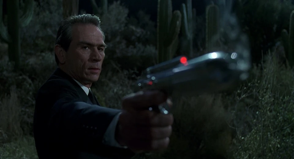 Zed along with Kay and Jay spot an Arquilian Battle Cruiser nearby Earth. Zed then tells the duo to head to Rosenberg's Jewelry Store, and also to give J a weapon. K grabs his weapon and hands J a Noisy Cricket. J immediately is annoyed and questions why he gets such a small weapon. They arrive at the Jewelry store and it had already been broken into with nothing stolen. J then spots the bug in an 'Edgar suit' (Edgar was the husband of the woman who claimed an alien stole his skin). J tells K to get down, he then fires his Noisy Cricket several times but misses. Although he does stop Edgar the Bug's old vehicle with his ship placed inside. After J fired his weapon many times in public, K explains not to do so. Kay also tells Jay that there is always an Arquilian Battle Cruiser or a similar situation with Earth in danger, and the only way these people can get on with their lives is if they don't know about it.